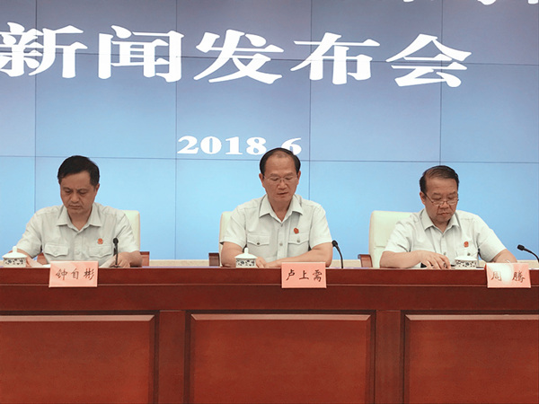 高院党组成员、副院长卢上需(中)、高院审委会专职委员周腾(右)、高院刑一庭副庭长钟自彬(左)出席新闻发布会