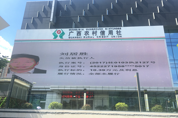 “李维,失信被执行人,执行案号:(2017)桂0103执1409号,身份证号:4502051980XXXX1374,执行标的:202.70万元及利息,履行情况:全部未履行……”6月28日起,广西农村信用社三祺广场网点前的大屏幕上突然出现前所未有的失信被执行人名单和照片。