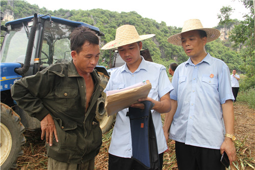 6月21日上午10时许,骄阳似火,扶绥法院按照执行方案,由该院执行局唐光席局长带队,组织24名干警执结一起财产损害赔偿纠纷案,清理涉案土地上附着物,将被黄某等五人占用的土地返还给申请执行人农某。执行过程邀请县人大代表、政协委员各一名进行现场监督。